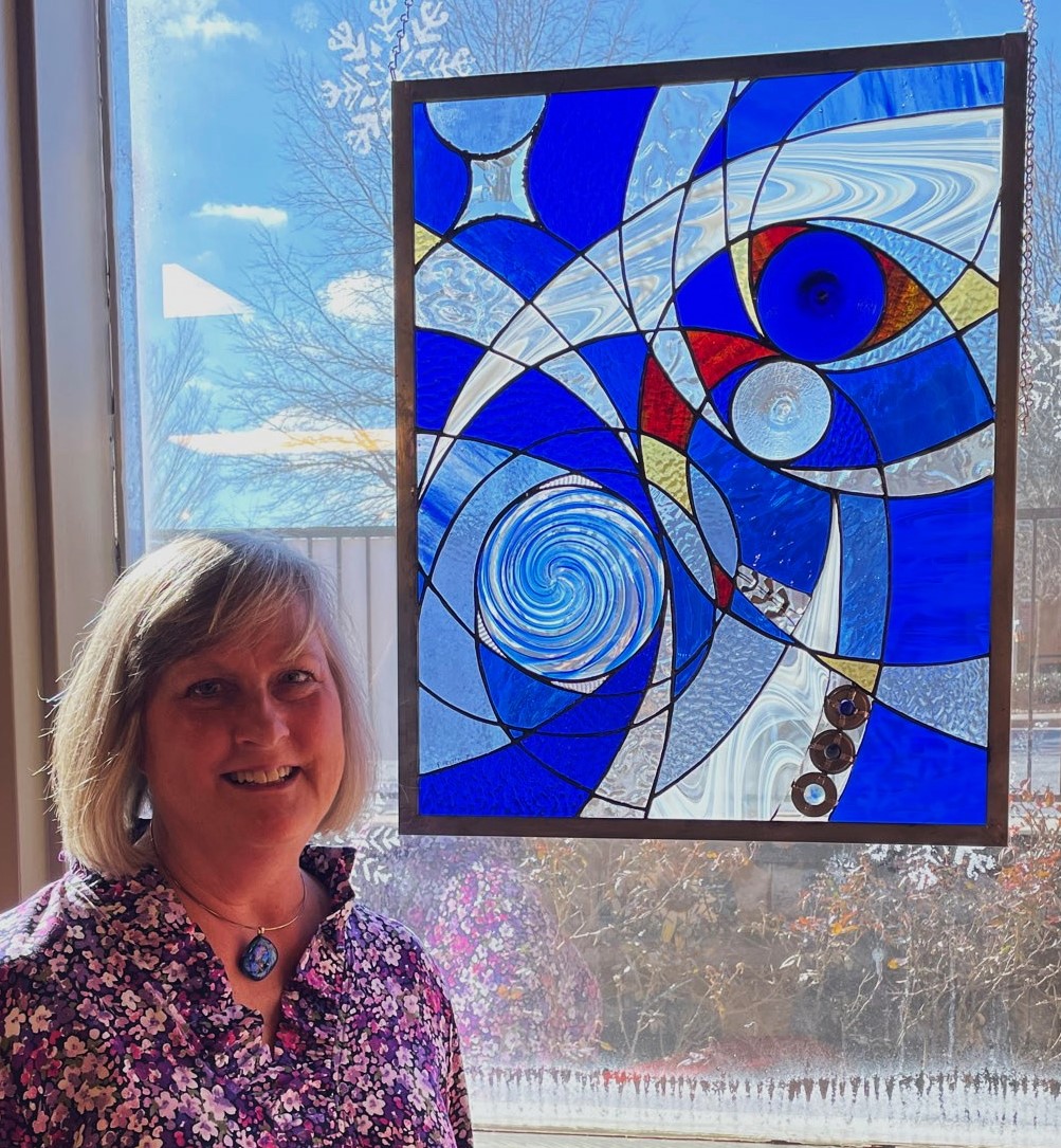 Full of Whimsy, Fantasy and Humor, this panel contains metal washers, wing nuts and marbles, all found objects from my farm, repurposed into this beautiful stained glass panel.